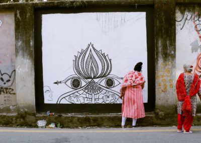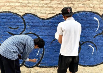 Creating murals means engaging in deep, collaborative exchanges with the neighbourhoods where we work. Each mural project begins with an extensive research phase, where our artists spend time engaging with local residents, listening to their stories, and understanding the unique histories, cultures, and aspirations that shape each community. This process is not rushed; it unfolds over long interactions, informal gatherings, and workshops that invite neighbours to share their perspectives and dreams for the space.