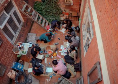 Artists in residence at Kaalo.101 have access to private rooms, communal studios, outdoor spaces, and a well-equipped library and kitchen. The residency experience is intentionally rooted in the vibrant fabric of Patan, offering opportunities to connect with local artists, activists, communities, and histories. Residents can participate in exhibitions, workshops, talks, and collaborative projects, and are encouraged to share their processes and outcomes in ways that foster learning and connection.